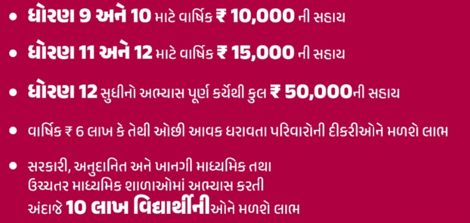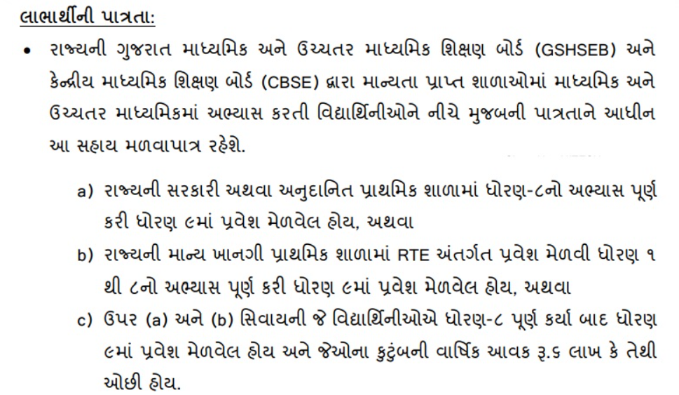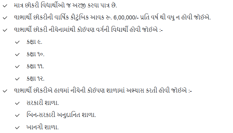 - ધોરણ 9 થી 12માં નિયમિત અભ્યાસ કરતી હોવી જોઈએ