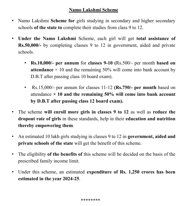 ગુજરાત સરકાર દ્વારા રાજ્યની દીકરીઓના શિક્ષણને પ્રોત્સાહન આપવા માટે નમો લક્ષ્મી યોજના 2025 શરૂ કરવામાં આવી છે. આ નમો લક્ષ્મી યોજના ગુજરાત હેઠળ 9 થી 12 ધોરણની વિદ્યાર્થીનીઓને માસિક નાણાકીય સહાય આપવામાં આવશે. યોજનાનો મુખ્ય હેતુ દીકરીઓને આર્થિક મુશ્કેલી વિના ઉચ્ચ શિક્ષણ આપવા છે જેથી તેમનું ભવિષ્ય ઉજ્જવળ બને.